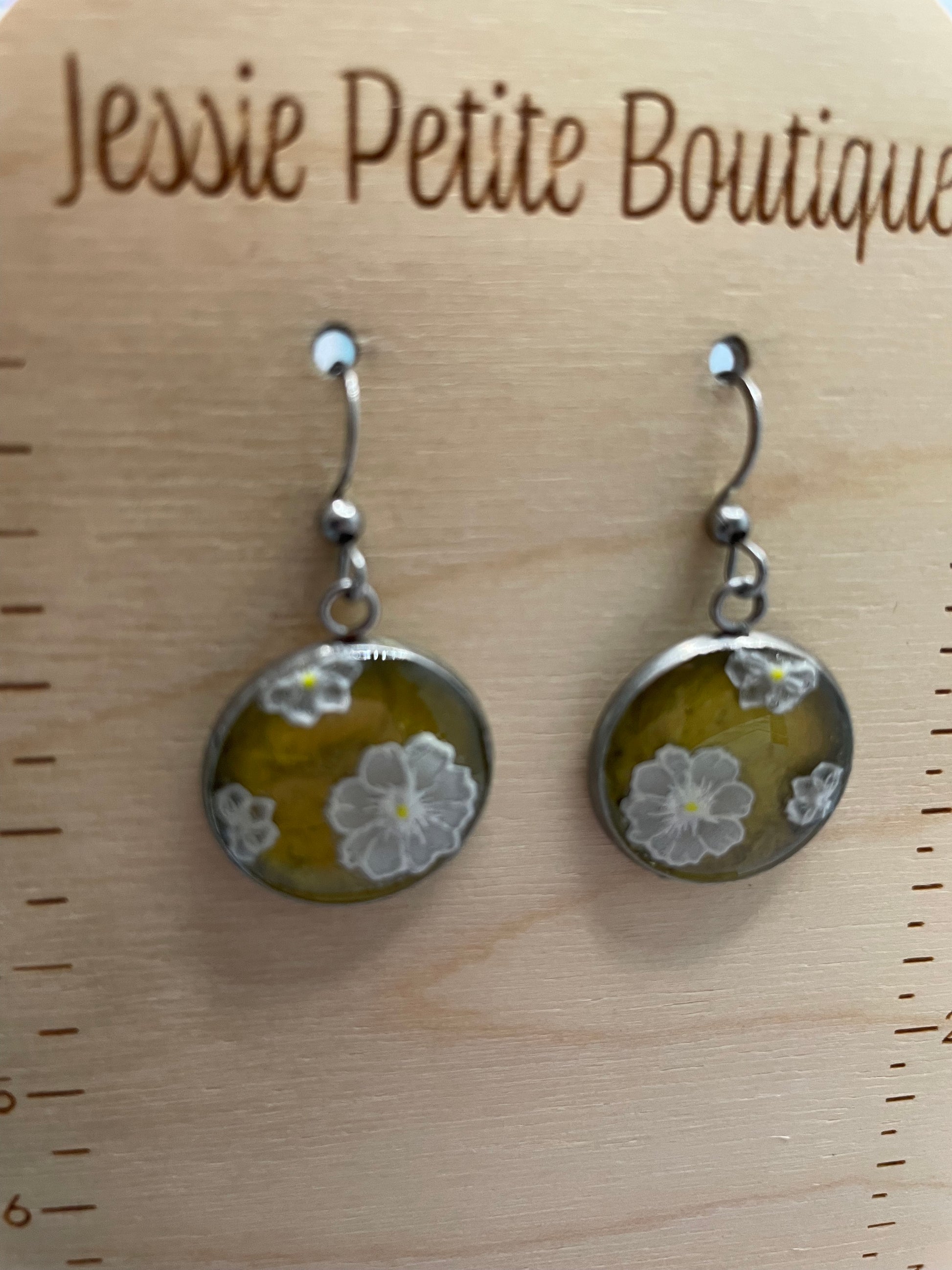 These round bezel earrings feature delicate white floral details softly set against a rich green background. The subtle shimmer created by mica powder adds depth and luminosity, while the resin finish enhances the fine details of each flower. Lightweight and comfortable, they are perfect for everyday wear or as a gentle accent to a nature-inspired look.