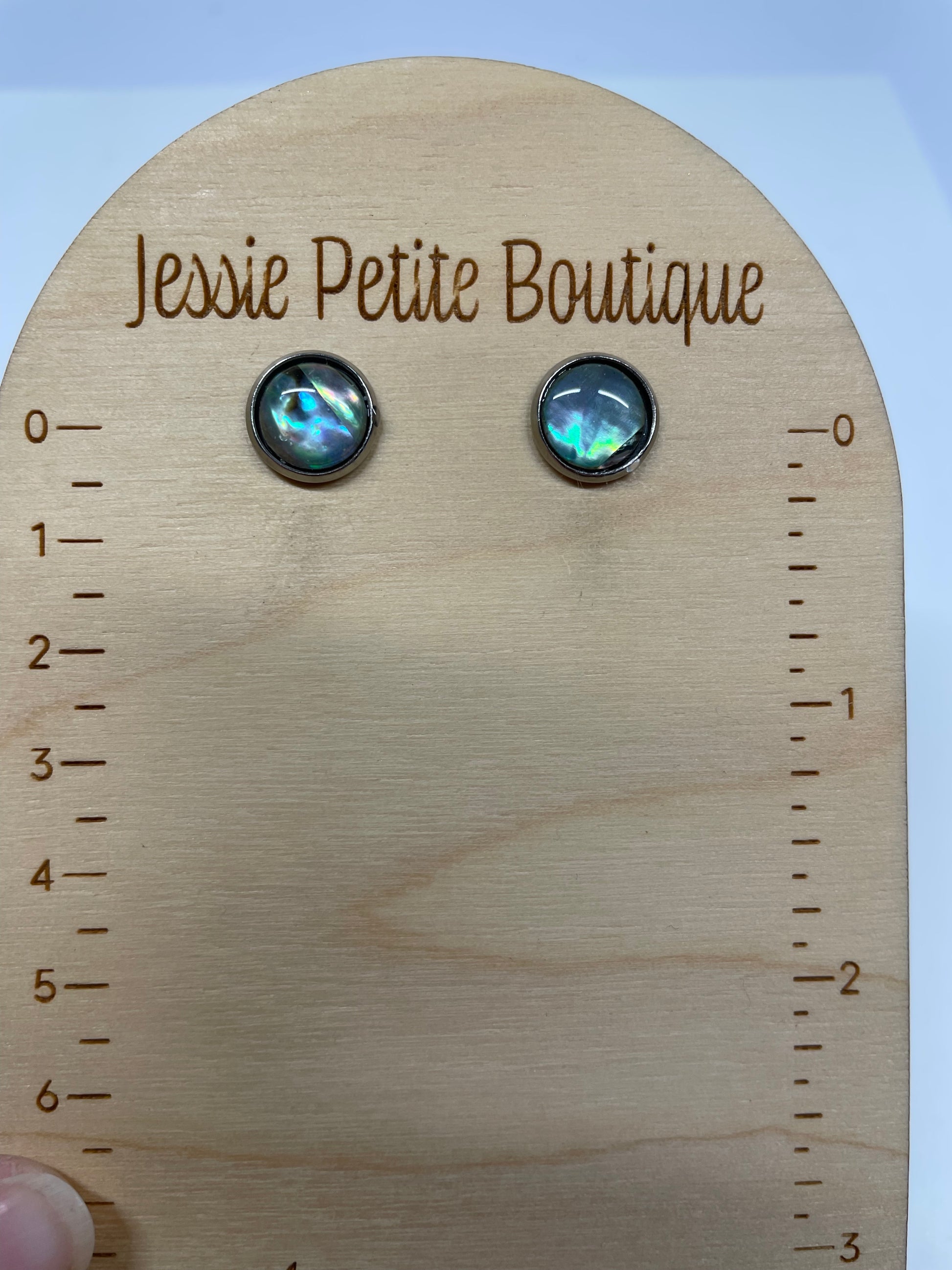 Each piece features a shimmering shell cabochon set in polished stainless steel — either white shell or a darker shell colour- elegant, lightweight, and perfect for everyday wear.