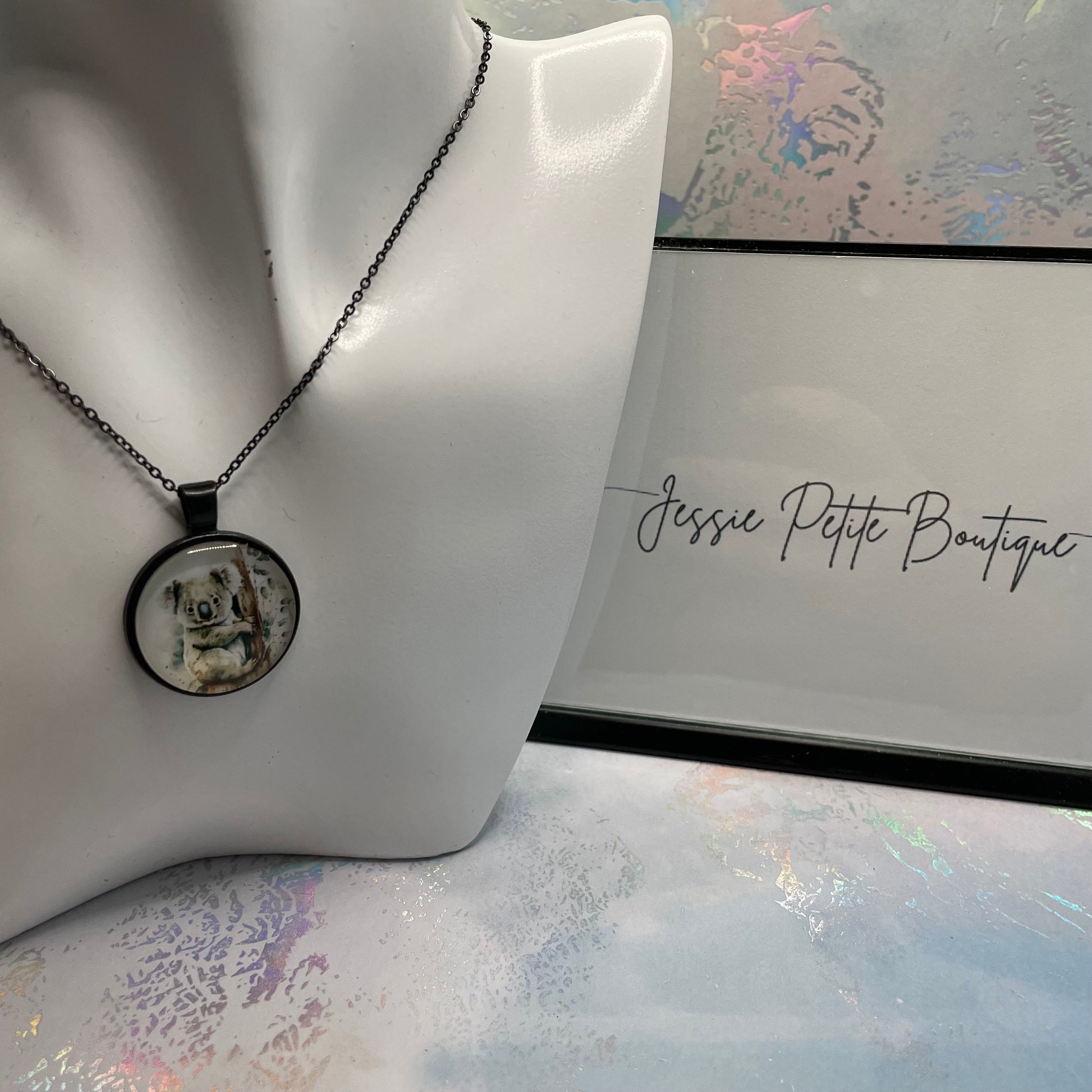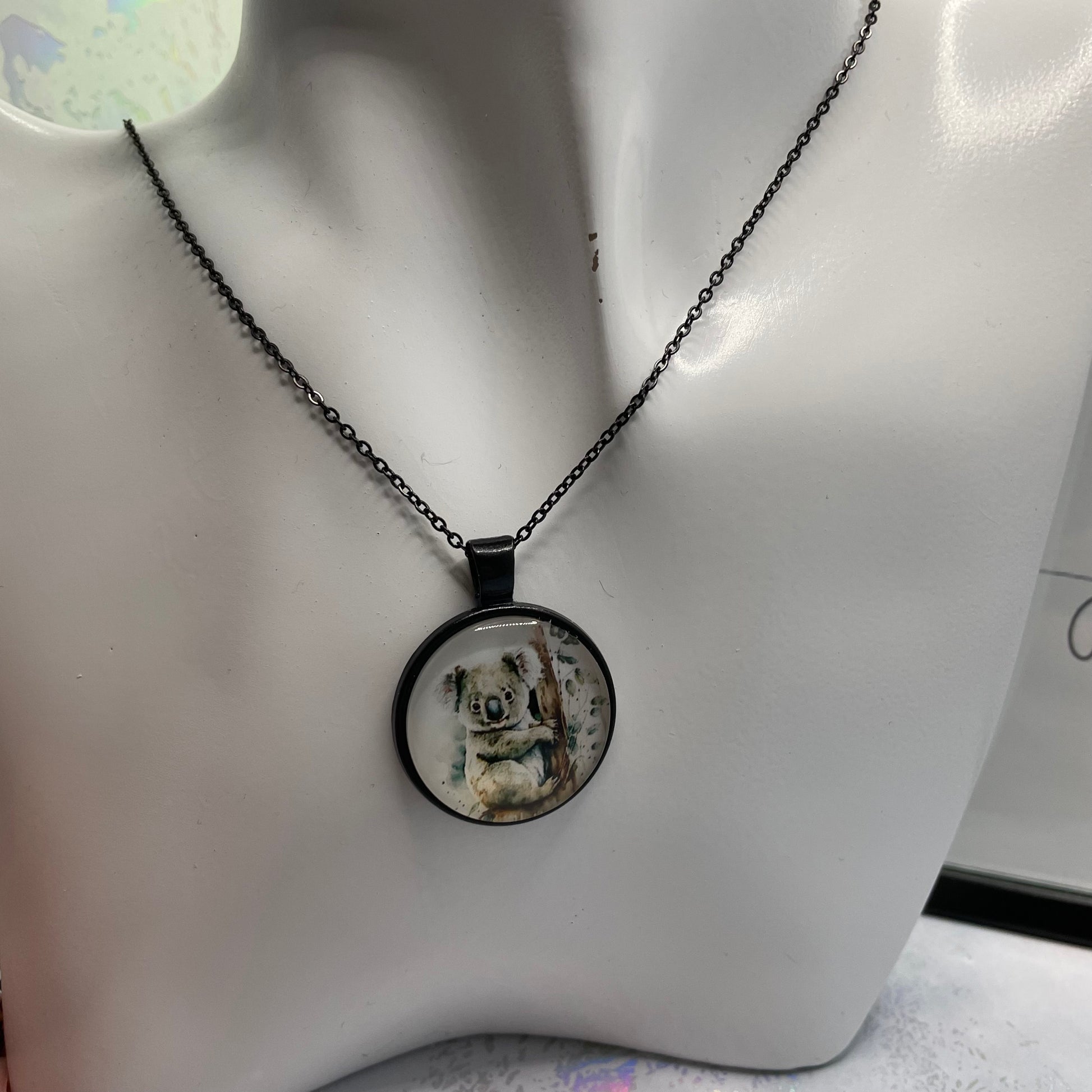 Discover the charm of our animal glass cabochon necklace featuring a cute koala design. This elegant piece comes with a 22-inch nickel free black chain, a nice option for those with sensitive skin. Elevate your style with this exquisite accessory today!