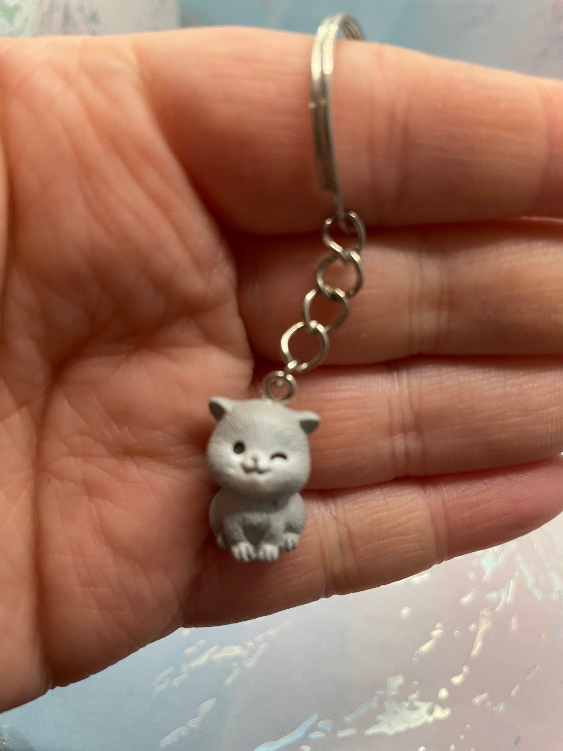 This adorable cat keychain features a charming winking expression that brings its playful personality to life. Crafted with care, the soft matte finish highlights the delicate fur texture and rounded silhouette, making it a delightful accessory for everyday use.