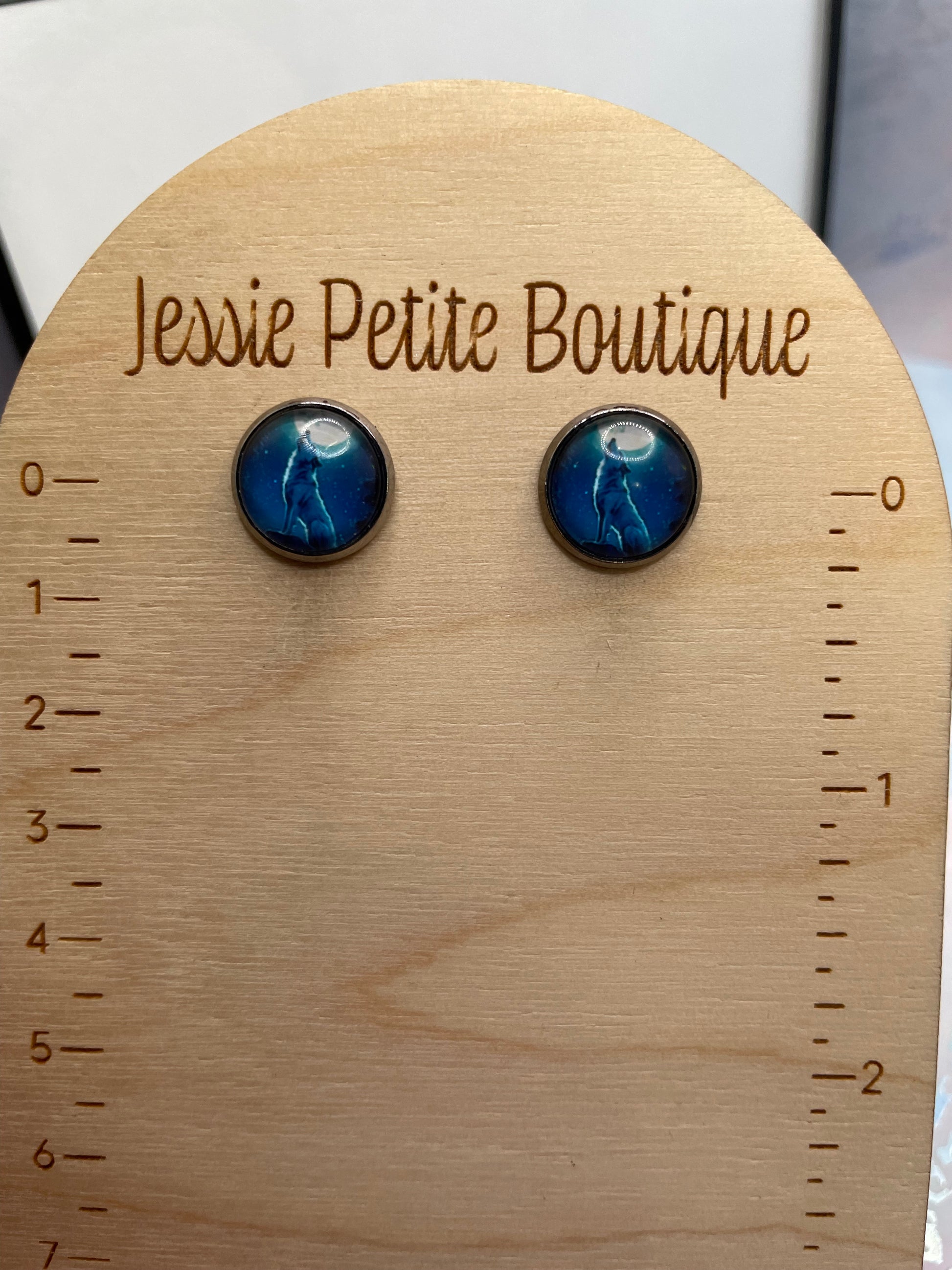 These stud earrings feature a striking wolf silhouette set against a deep blue, star-like background with a bright moon, captured beneath a smooth glass cabochon. The design evokes a calm, nocturnal atmosphere while remaining elegant and easy to wear.