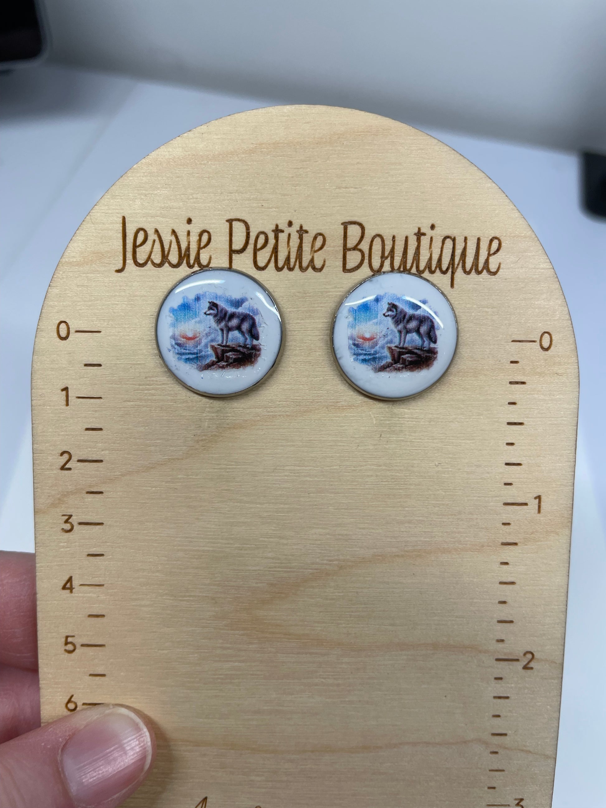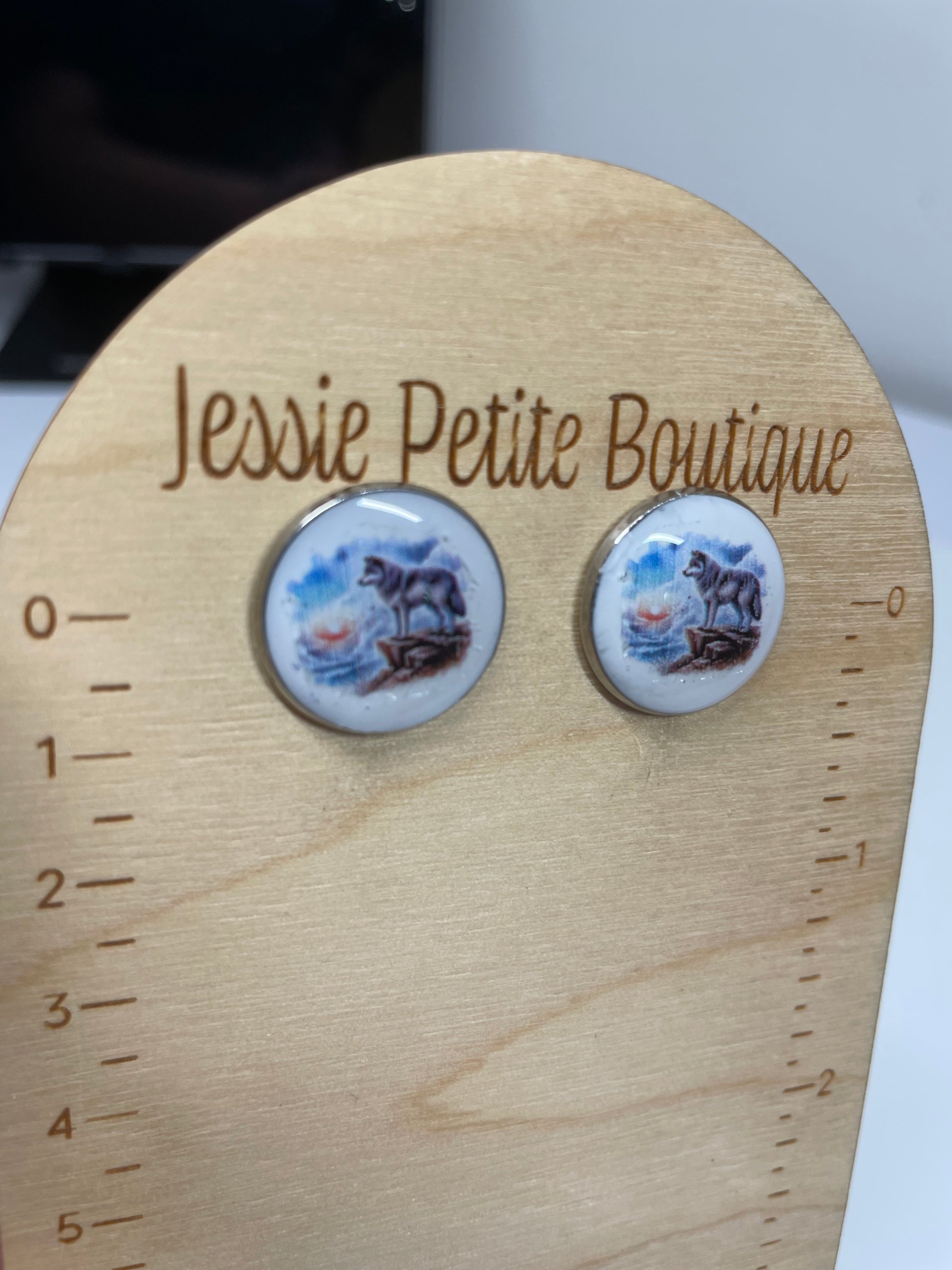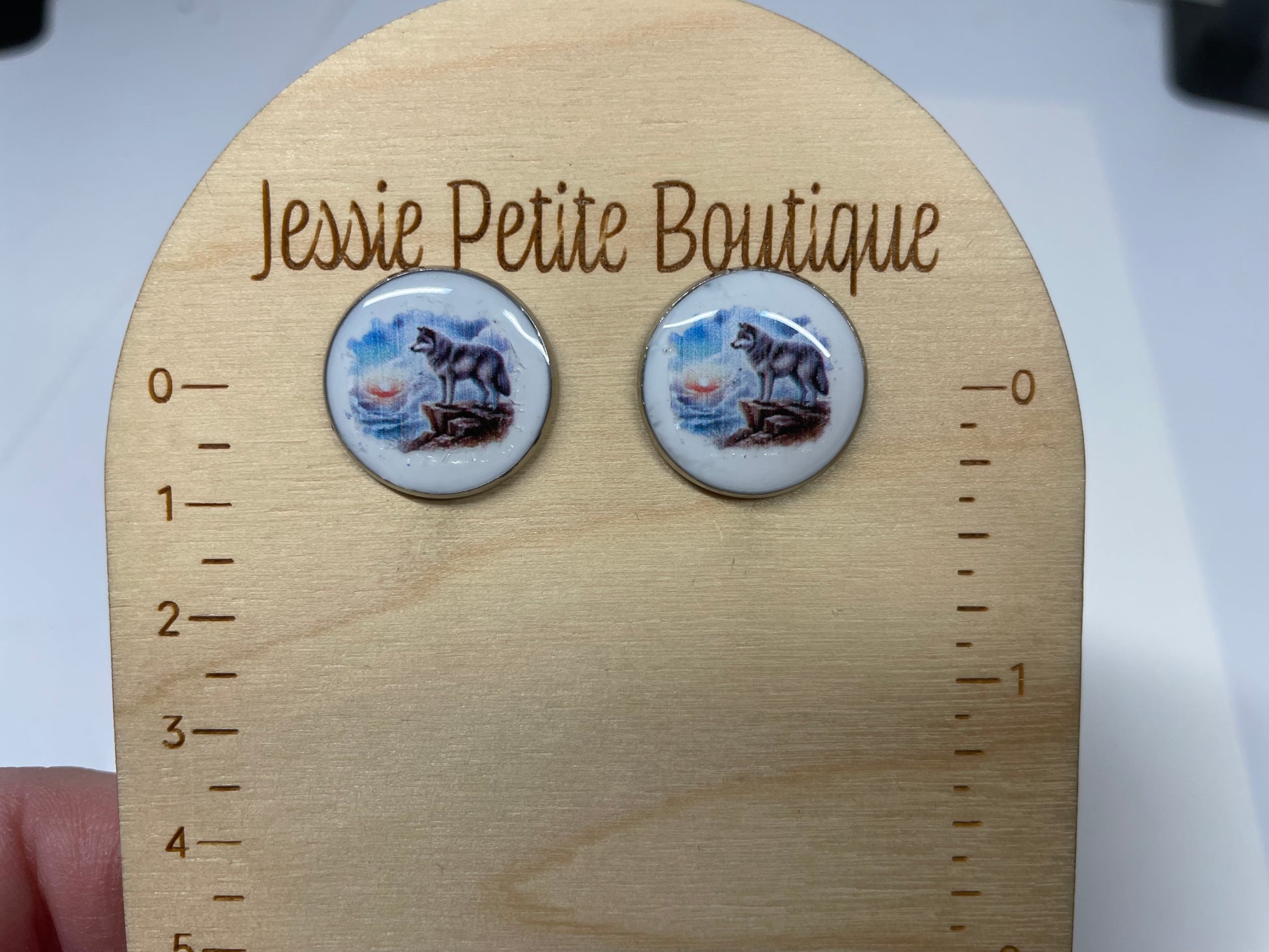 These wolf stud earrings feature a detailed illustration of a wolf standing on a rocky ledge, set against a soft, atmospheric background. Encased in smooth, glossy resin, the design is enhanced with subtle mica powder for a gentle shimmer that catches the light beautifully.