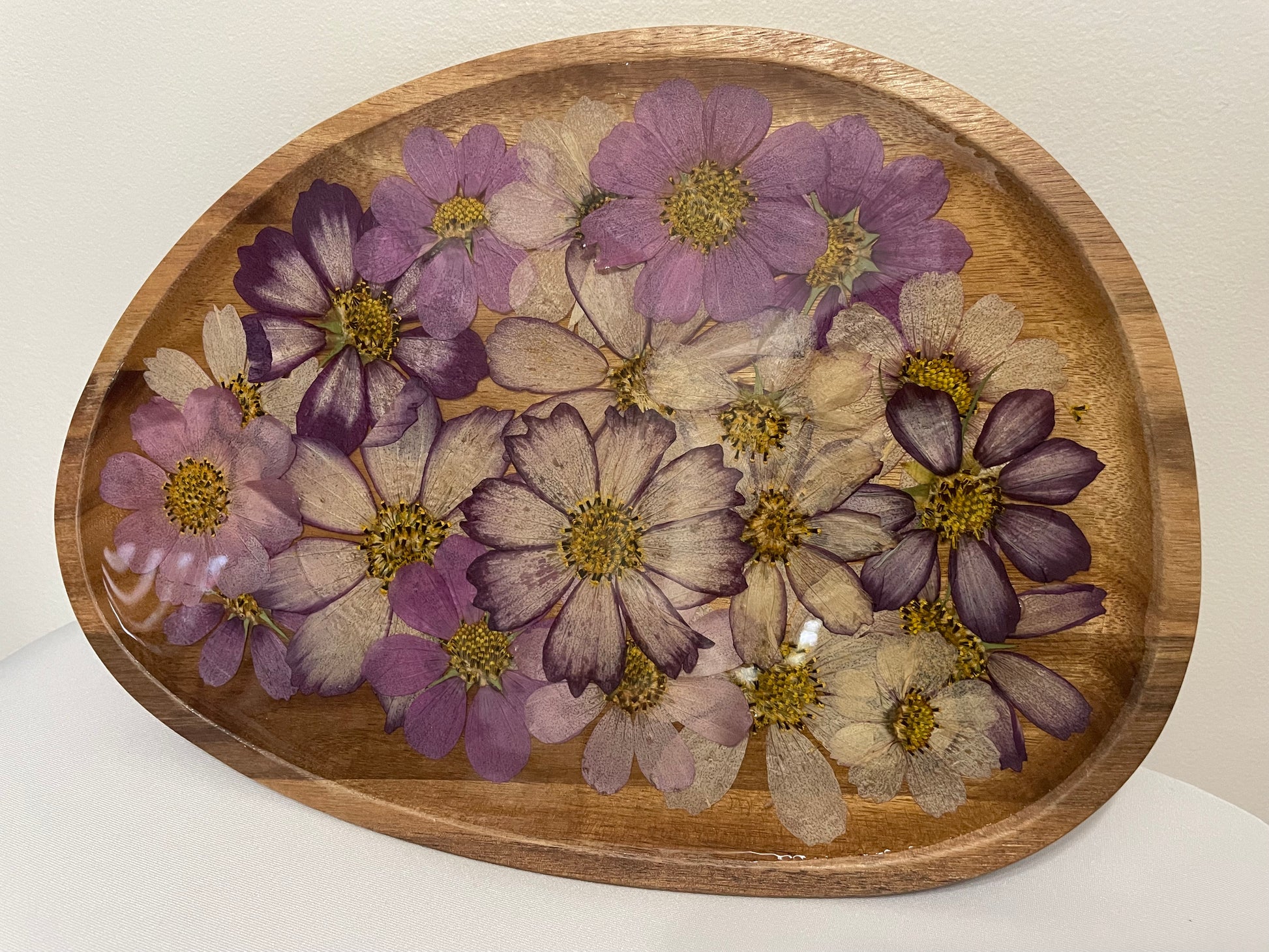 Each tray is one of a kind, as every flower is naturally unique. Use it as a decorative display, vanity tray, or catch-all board for jewelry, candles, or small keepsakes.