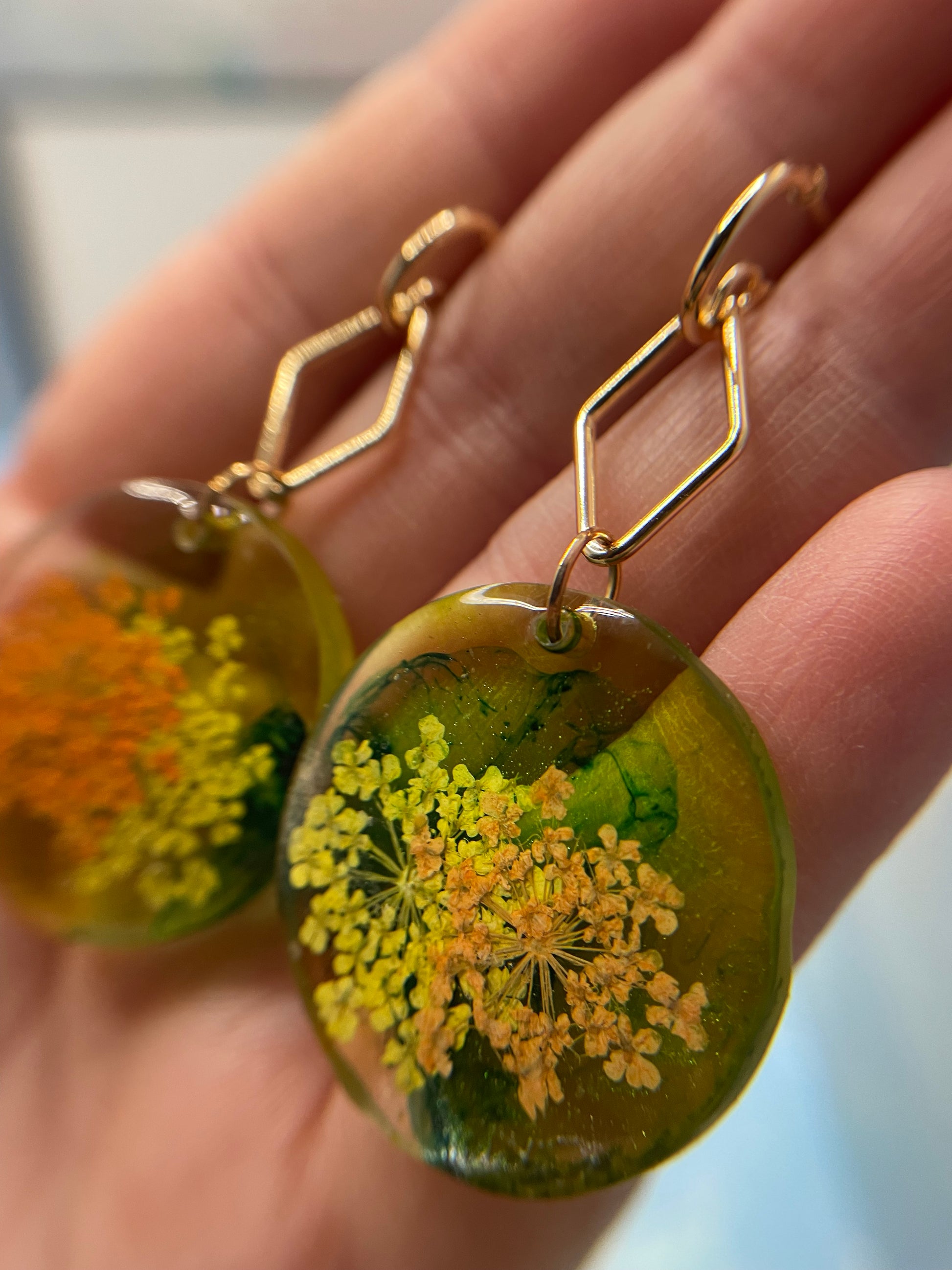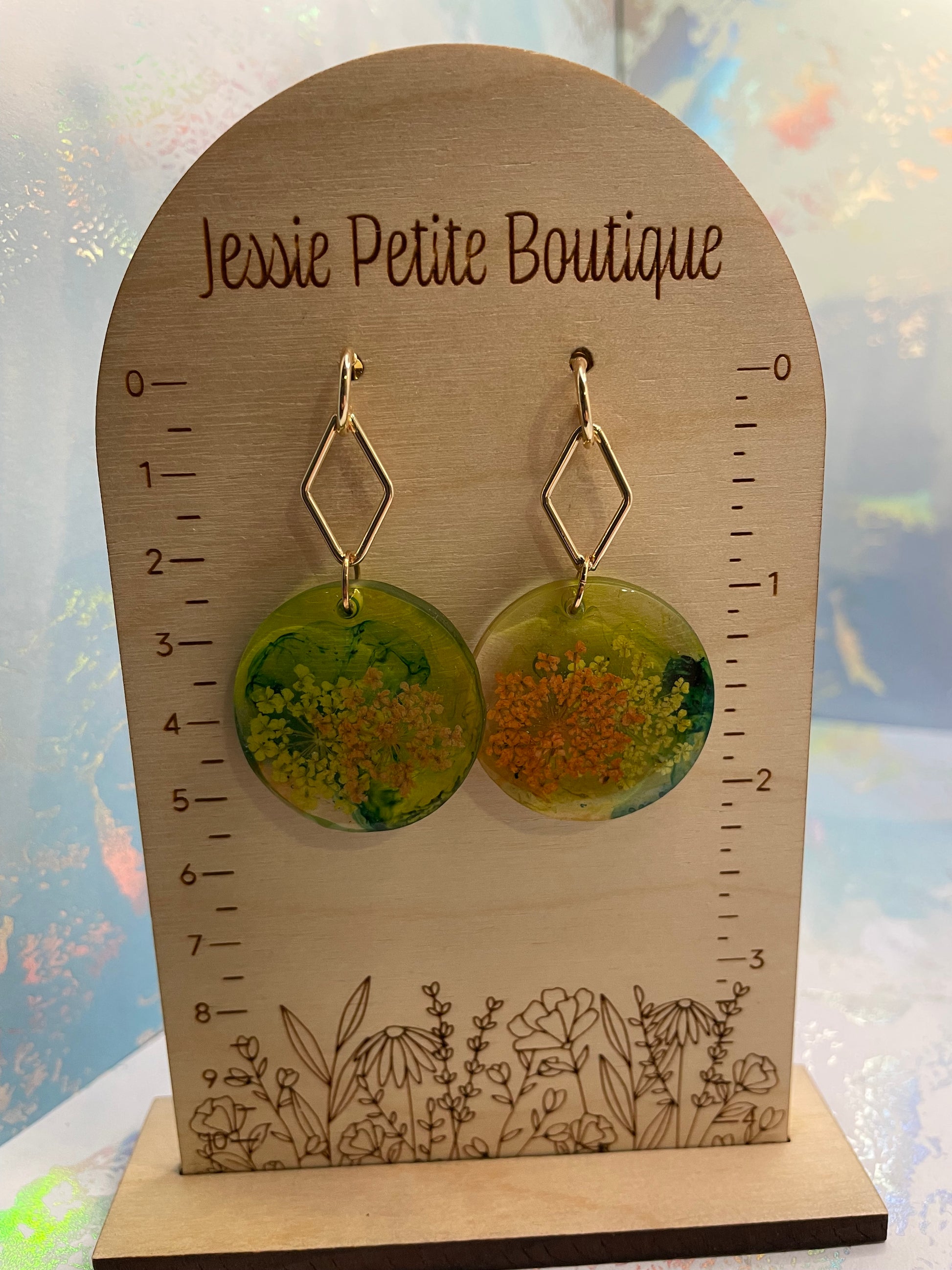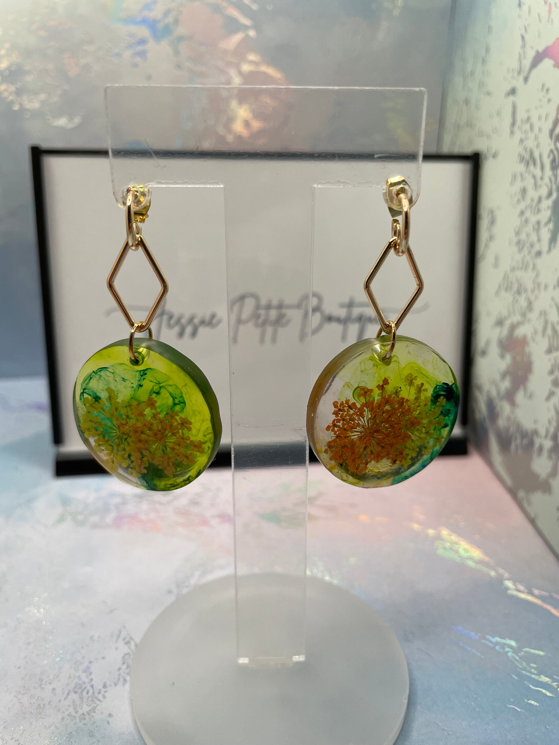 Brighten up your style with our "Yellow & Orange Flower" resin earrings. These radiant round earrings feature vibrant yellow and orange flowers delicately set within translucent yellow and green resin, creating a refreshing, nature-inspired design. The gold-plated accents add a touch of elegance to this floral beauty.